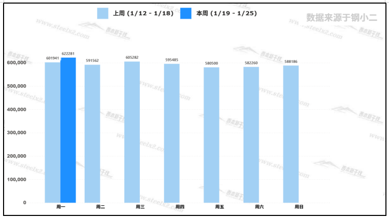 據(jù)鋼小二平臺(tái)樣本數(shù)據(jù),1月19日建筑鋼材社會(huì)庫(kù)存量為622,281噸,較上周五交易日庫(kù)存上升7.2%。