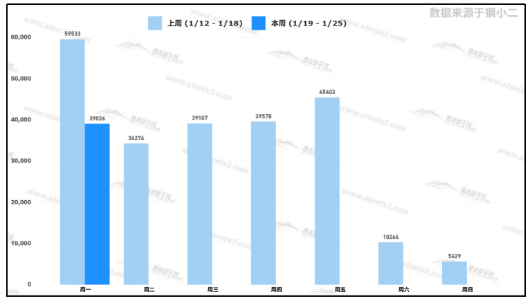 據(jù)鋼小二平臺(tái)樣本數(shù)據(jù),1月19日采樣全國(guó)工程需求量為39,036噸,較上個(gè)五下降14%。