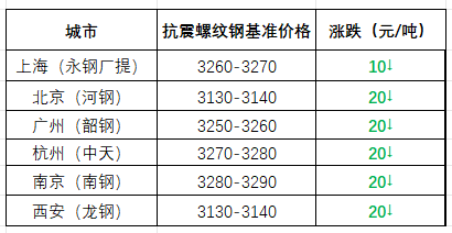 截至午間,國內(nèi)部分市場螺紋鋼(抗震)基價(jià)如下:上海市場3260-3270元/噸;北京市場3130-3140元/噸;廣州市場3250-3260元/噸;杭州市場3270-3280元/噸;南京市場3280-3290元/噸;西安市場3130-3140元/噸。環(huán)比來看,截至午間收盤,全國主要市場一線品牌價(jià)格下跌。
