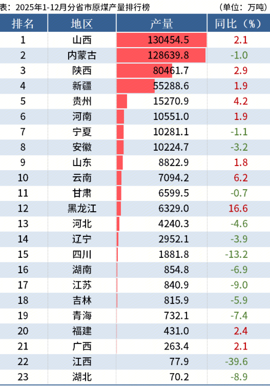 從分省數(shù)據(jù)來看,2025年1-12月山西、內(nèi)蒙古和陜西原煤產(chǎn)量累計同比分別增長2.1%、-1.0%和2.9%。