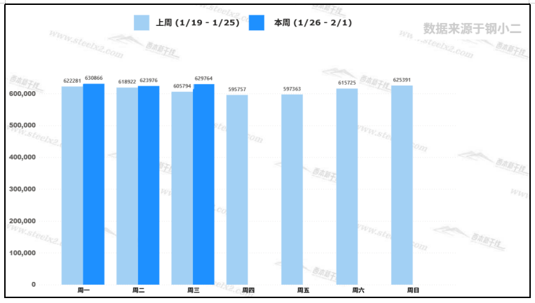 據(jù)鋼小二平臺樣本數(shù)據(jù),1月28日建筑鋼材社會庫存量為629,764噸,較上個交易日增加0.9%。