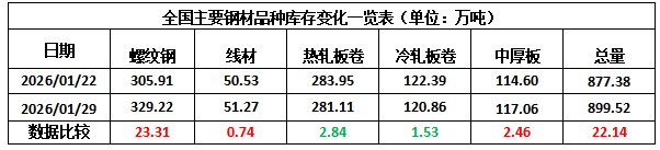 據(jù)西本資訊歷史數(shù)據(jù),當(dāng)前庫存總量較上年同期(2025年1月30日的1081.50萬噸)減少181.98萬噸,降幅為16.83%。分品種看,本期五大鋼材品種中,熱軋板卷和冷軋板卷庫存減少,其它品種庫存回升。(見下圖)