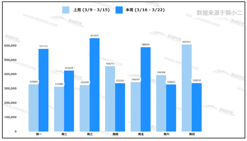 據(jù)鋼小二平臺樣本數(shù)據(jù),3月20日建筑鋼材社會庫存量為588,695噸,較上周五交易日庫存量增加。