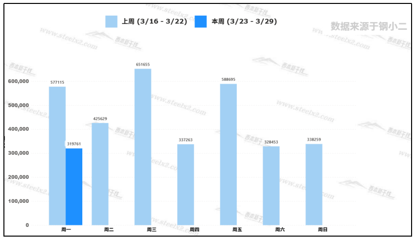 據(jù)鋼小二平臺(tái)樣本數(shù)據(jù),3月23日建筑鋼材社會(huì)庫存量為319,761噸,較上周五交易日庫存量下降。