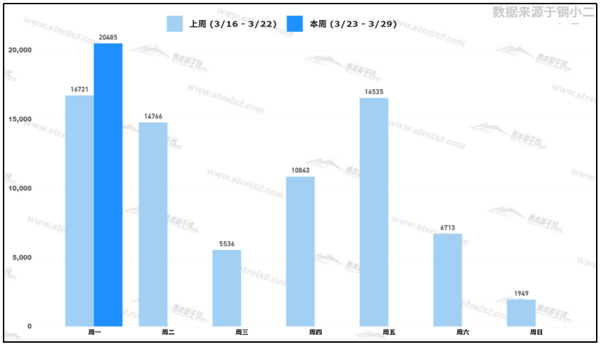 據(jù)鋼小二平臺(tái)樣本數(shù)據(jù),3月23日采樣全國工程需求量為20,485噸,較上周五交易日環(huán)比增加23%。